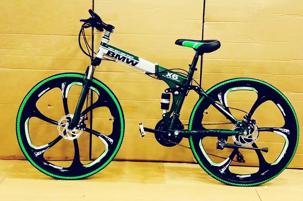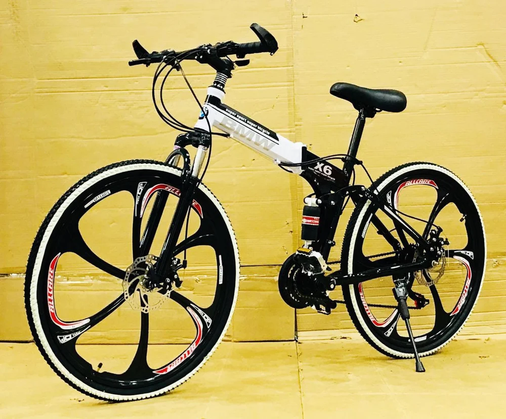 FOLDABLE CYCLE WITH MAC WHEELS.21 GEARSDual Tone Double Coated antirust PaintDual Shock Absorbers160mm Mechanical Double Disc BrakeAdjustable SeatAlloy Mac Wheels26*4 Inch TyresAll Types of Cycles available at reasonable prices 120 Weight Capacity (Tested)Free:Mud Guard SetBottle HolderTool-KitPlease WhatsApp us for more details.