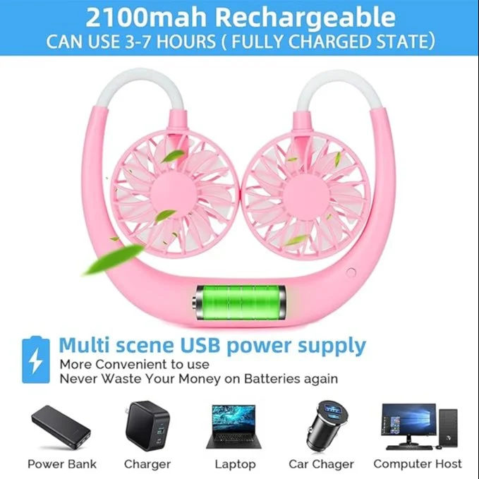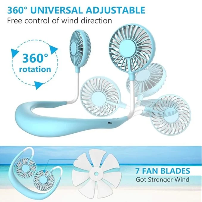 360° Rotating - Two fans can 360° flexible rotate, which allow you to adjust the best wind direction, can be used as a desk fan or a neck fan. You won’t feel uncomfortable or tied when you hang the fan for a long time, thanks to its lightweight, soft and skin-friendly silicone material of the handle. A wonderful summer gift for your friends and families.
