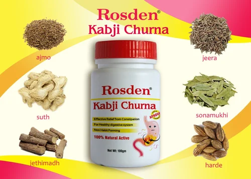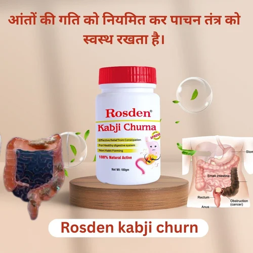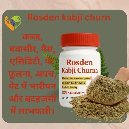 ROSDEN KABJI CHURN – Ayurvedic Digestive PowderNatural Relief from Constipation & IndigestionProduct Description:ROSDEN KABJI CHURN is a 100% Ayurvedic digestive powder formulated to provide quick and effective relief from constipation, gas, acidity, and indigestion. Made with a blend of time-tested herbs, it supports healthy digestion and regular bowel movement without any side effects.Key Benefits:✅ Relieves constipation naturally✅ Improves digestion and appetite✅ Reduces gas, bloating, and acidity✅ Promotes smooth bowel movement✅ Safe for regular use – No chemicals, No side effectsHow to Use:Take 1-2 teaspoons (3-5g) with lukewarm water or coconut water at bedtime or as directed by a physician.
