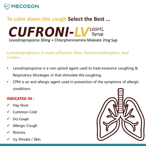 Chlorpheniramine Maleate (2mg/5ml) + Levodropropizine (30mg/5ml) Syrup is used in the treatment of dry cough. It helps to reduce cough associated with allergies by blocking the effects of a chemical messenger. It also provides relief from runny nose, sneezing, itching and watery eyes.
