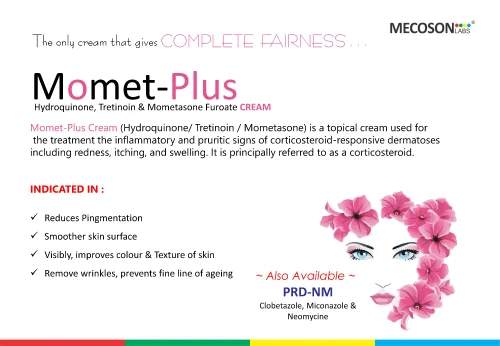 Momet Plus ( Hydroquinone + Mometasone + Tretinoin ) Cream is a Cream It is commonly used for the diagnosis or treatment of Lighten skin, freckles, nasal polyps, dermatitis, acne.