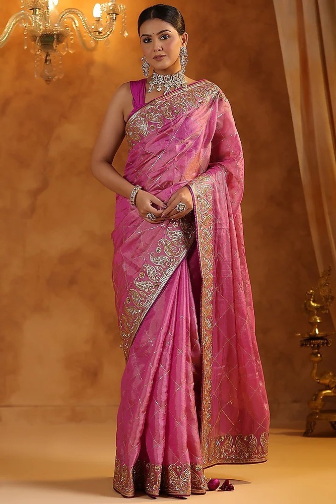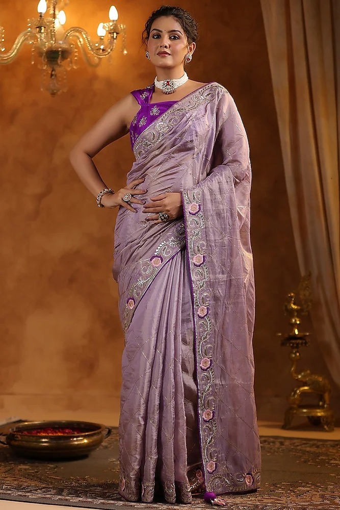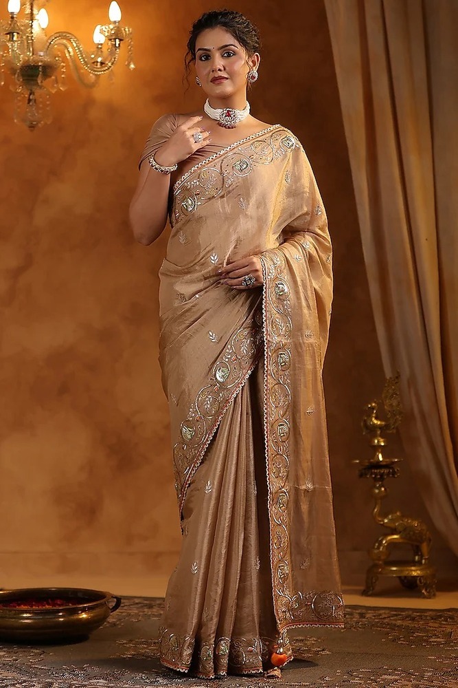 Golden Katan Silk Tissue Resham Embroidered Saree Set