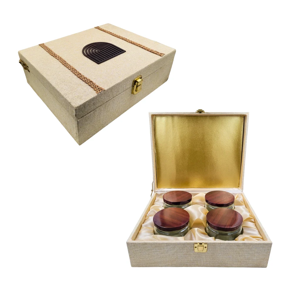 Wooden MDF Box with 4 Glass Jars. Different designs available in different range. Best For Dryfruits Packaging and especially Gifting.