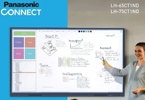 The Panasonic LH-75CT1ND is a 75-inch interactive display panel with a 4K UHD resolution (3840 x 2160). It features an anti-glare LCD with edge-lit LED, a minimum contrast ratio of 1100:1, and a typical brightness of 450 nits. The display is touch-sensitive and pen-driven, with an infrared